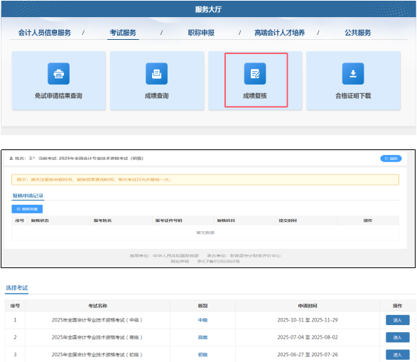 申请人登录全国统一平台后,通过服务大厅或会计专业技术资格考试模块进入“成绩复核”功能;在对应的考试列表栏目点击“进入”功能即可进行成绩复核(可以申请成绩复核的考试列表在成绩复核期间开启,其他时间关闭)。如下图所示: